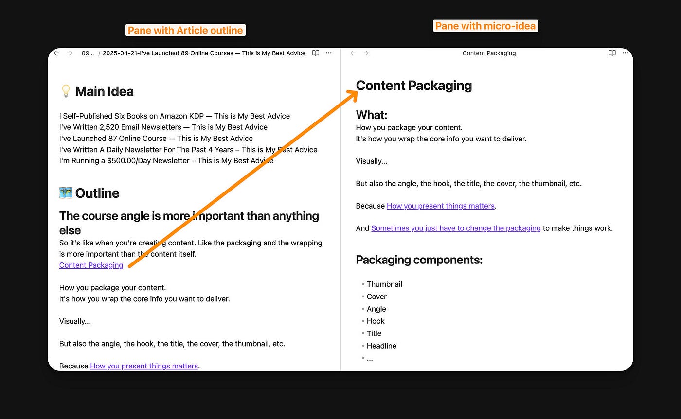 I don’t just link ideas together. I also link the raw knowledge to the actual content I’ve created.