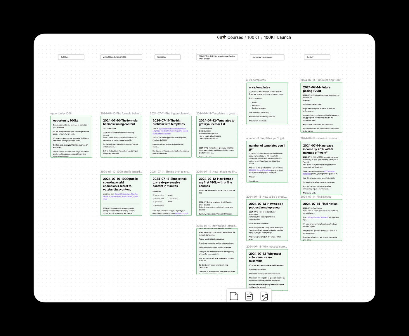 The canvas also helps me spot gaps in my strategy. Maybe I have great pre-launch content, but nothing planned for after the cart closes. The visual layout makes these issues obvious.